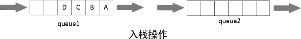 入栈和出栈,都在 queue1 中完成,而 queue2 作为中转空间。- 入栈:直接入 queue1 即可。
