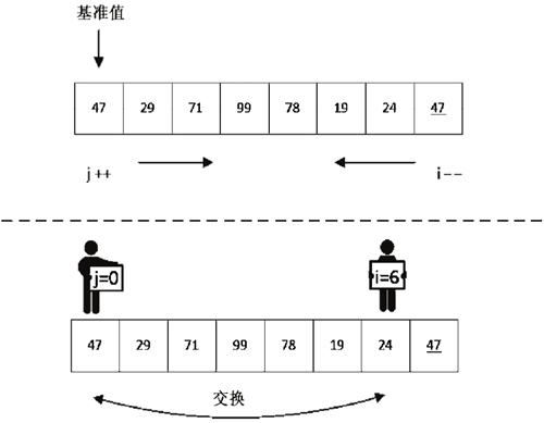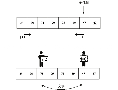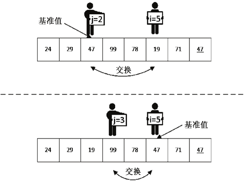 此时交换后的数列变为 24、29、47、99、78、19、71、47。接下来我们继续对 i、j 进行操作,如图 3 所示,继续进行 i-- 及 j++ 的比较操作。