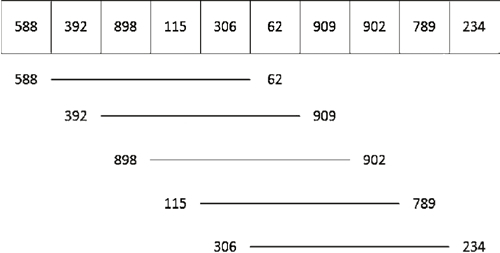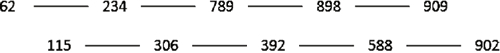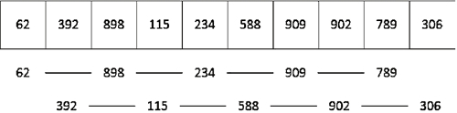 这里就不再复述插入排序的步骤了,大家应该可以轻易地完成对两组数据的插入排序了。第 2 趟排序的结果如图 4 所示。现在的待排序的数列变为 62、115、234、306、789、392、898、588、909、902。