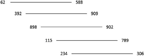 在本实例中的首选增量为 n/2,n 为待排序的数列的长度,并且每次的增量都为上一次的 1/2。待排序的数列为 588、392、898、115、306、62、909、902、789、234,有 10 个数。我们首选增量为 10/2 即 5,进行如图 1 所示的分块。