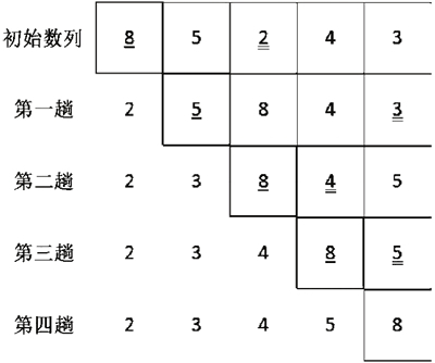 其中的方框部分为待排序的数列部分,双下画线的元素为待排序的数列中最小的元素,单下画线的元素为待排序的数列的首元素,每一趟让它们进行交换,最终得到有序数列。