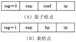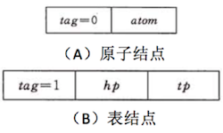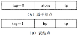根据原子和子表的不同,链式存储中的结点需要用两种不同的结构表示。对于原子来说,需要由两部分组成:标志位 + 值域(如图1(A));子表需要由三部分组成:标志位 + 指向表头的指针域 + 指向表尾的指针域(如图1(B))。