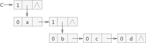 例如,使用图1的链表结构表示广义表 C = (a,(b,c,d)),效果图为: