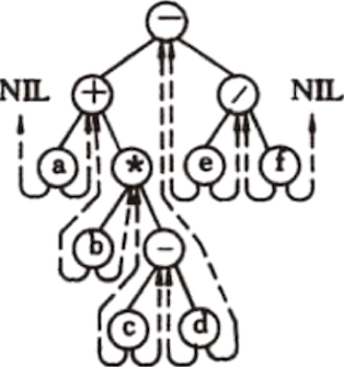 图 3 中是一个按照中序遍历建立的线索二叉树。其中,实线表示指针,指向的是左孩子或者右孩子。虚线表示线索,指向的是该结点的直接前趋或者直接后继。