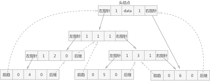 这样,二叉树中的线索链表就变成了双向线索链表,既可以从第一个结点通过不断地找后继结点进行遍历,也可以从最后一个结点通过不断找前趋结点进行遍历。
