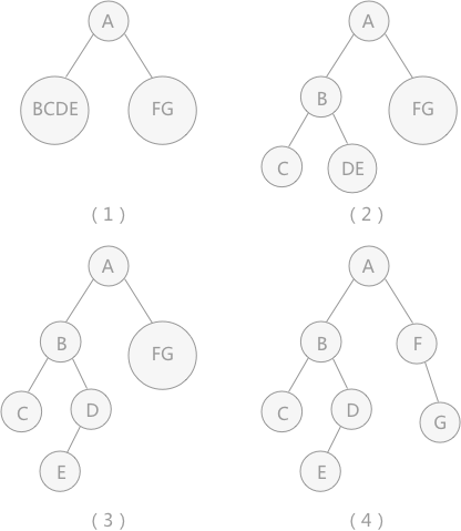 最后分析结点 A 的右孩子,由前序序列看到, F 在 G 前边,说明F为根结点。在中序序列中也是如此,说明,G 是 F 的右孩子。如图 2(4)所示。