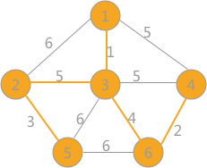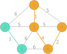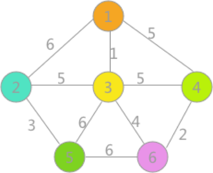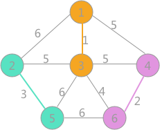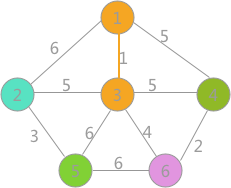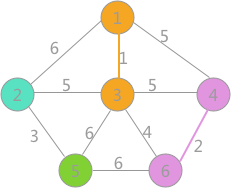 然后最小的是(3,6)边,两者标记不同,可以连接,遍历所有顶点,将与顶点 6 标记相同的所有顶点的标记更改为顶点 1 的标记: