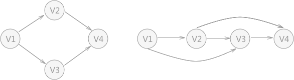 例如,图 1 中的两个图都是有向无环图,都可以使用拓扑排序对图中的顶点进行排序,两个图形的区别是:左图中的 V2 和 V3 之间没有明确的前后顺序;而右图中任意两个顶点之间都有前后顺序。