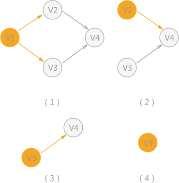 进行拓扑排序时,首先找到没有前驱的顶点 V1,如图 2(1)所示;在删除顶点 V1 及以 V1 作为起点的弧后,继续查找没有前驱的顶点,此时, V2 和 V3 都符合条件,可以随机选择一个,例如图 2(2) 所示,选择 V2 ,然后继续重复以上的操作,直至最后找不到没有前驱的顶点。