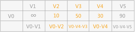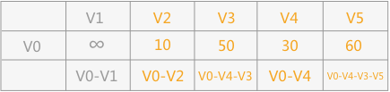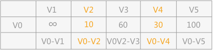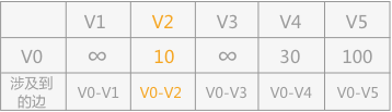 从 V0 出发,由于可以直接到达 V2 和 V5 ,而其它顶点和 V0 之间没有弧的存在,所以之间的距离设定为无穷大,可以得到下面这个表格: