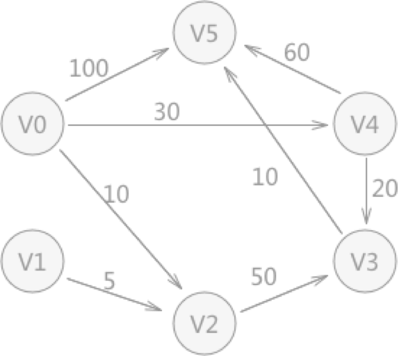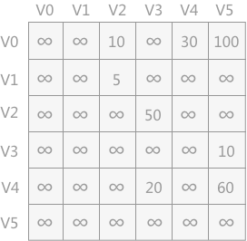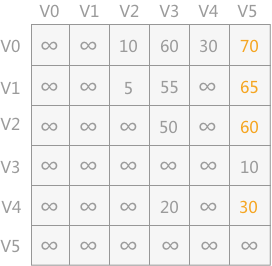 而对于顶点 V5 来说,和顶点 V0 和 V1 相类似,所不同的是,V5 只有入度,没有出度,所以对各队顶点的距离不会产生影响。最终采用弗洛伊德算法求得的各个顶点之间的最短路径如上图所示。
