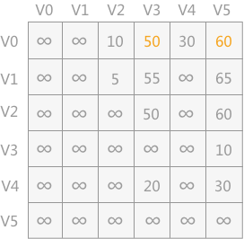 例如,(V0,V3)权值为无穷大,而(V0,V2)+(V2,V3)= 60,比之前的值小,相比而言后者的路径更短;同理 (V1,V3)也是如此。