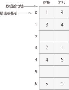 图2 中,链表头指针指向 a[0] ,表示为第一个结点,数据域存放的是 1,通过游标确定,下一个结点的位置在 a[3] ,数据域存放的是 2 ,依次类推。若游标为 0,表示此结点为链表的最后一个结点。