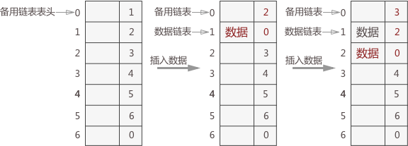所以,在整个过程中,需要自己动手把两者区分开,也就是需要自己实现 malloc 和 free 两个函数的作用。解决的办法是:提前将所有未被使用的结点链成一个备用链表。需要对链表做插入操作时,从备用链表上摘下一个结点使用;删除链表中的结点时,删除的同时链接到备用链表上,以备下次使用。