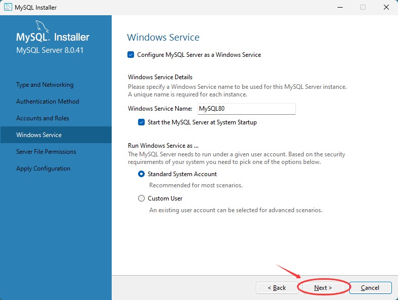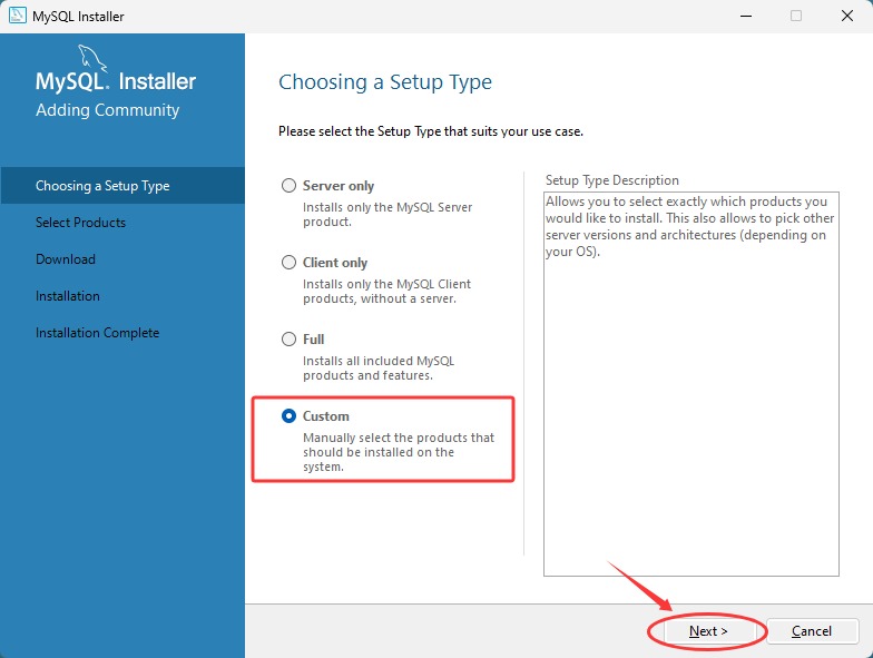 1) 这里以 8.0.41.0 版本为例(其他版本的安装过程是类似的),下载 MySQL 安装包(.msi),双击开始安装。2) 勾选自定义 custom,然后点击 Next: