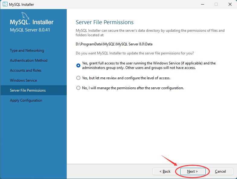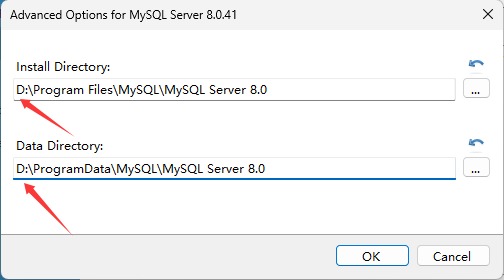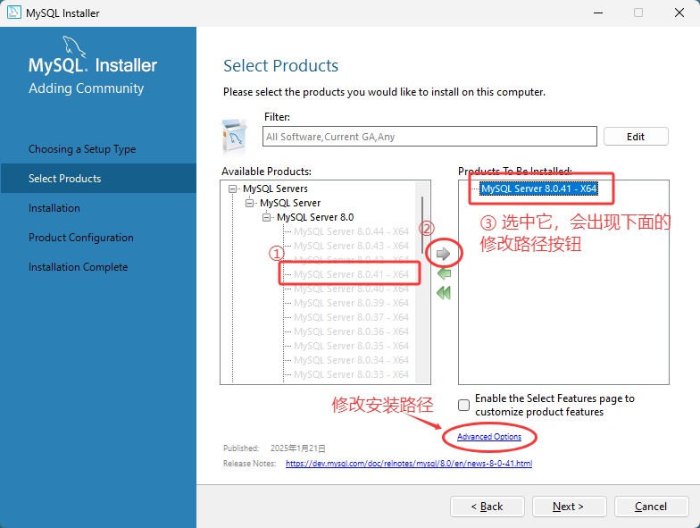 鼠标选中 MySQL Server 8.0.41-x64,点击“Advanced Options”,将 MySQL 的安装路径改为其他盘(非系统盘):