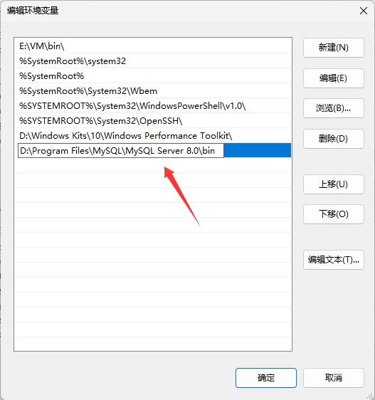 5) 点击 “新建”,将 MySQL 的安装路径下的 bin 目录(例如:D:\Program Files\MySQL\MySQL Server 8.0\bin)粘贴进去,点击 “确定” 保存设置: