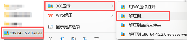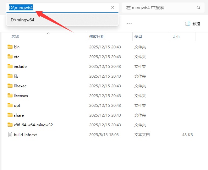 1) 我的电脑系统是 Windows 11 专业版,所以下载 x86_64-15.2.0-release-win32-seh-ucrt-rt_v13-rev0.7z 压缩包。2) 解压下载的压缩包,比如我将其解压后放到 D 盘的 Mingw64 文件夹里(路径是 D:\mingw64):