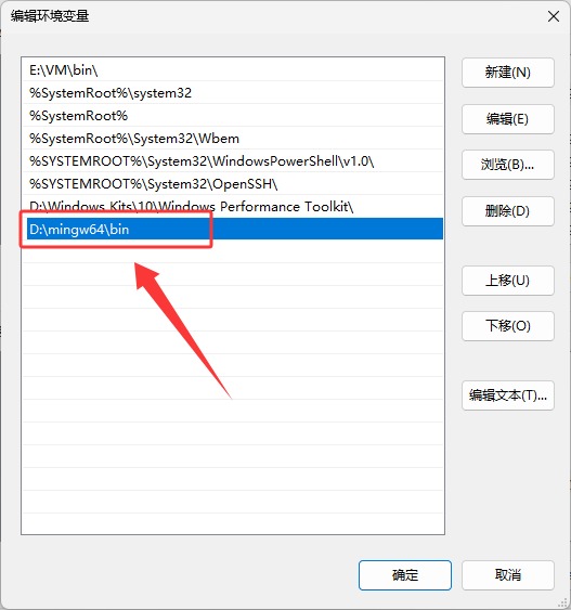 在 Path 变量编辑窗口中,点击"新建",然后把 D:\mingw64\bin 路径添加进入(D:\mingw64 是之前压缩包解压的文件夹路径):