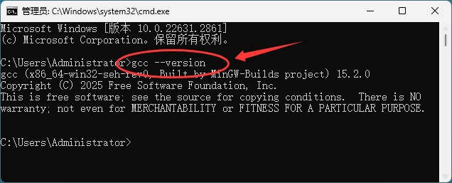 然后回弹出命令行窗口,输入 gcc --version 命令,如果如下图所示输出了 gcc 的版本信息,表明 MinGW-w64 安装成功了。