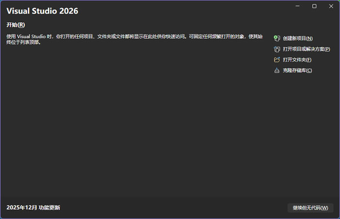 点击“继续但无代码”,跳转到 VS2026 的主界面: