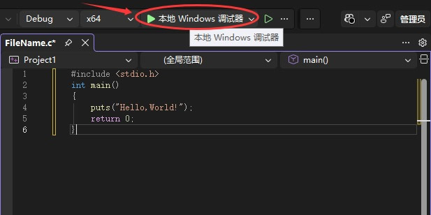 点击“本地Windows调试器”,开始运行 FileName.c 文件,如下图所示: