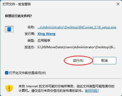1) 我使用的是 Windows 系统,下载 BitComet_2.18_setup.exe 安装包。2) 双击 BitComet_2.18_setup.exe 启动安装,如果弹出安全警告的窗口,点击“运行”: