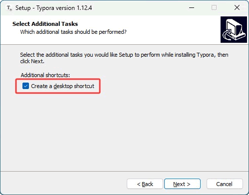 4) 建议勾选“Create a...”,这样安装成功后,桌面上就能自动添加 Typora 的快捷方式了。最后点击 Next: