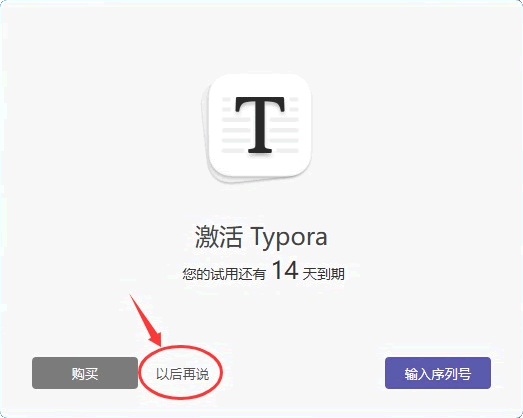1) 首次启动,Typora 会让我们选择是否输入序列号,这个序列号需要通过购买获得。大家可以点击“以后再说”,先试用 15 天,觉得不错之后再购买也不迟。