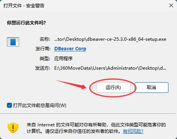1) 下载 dbeaver-ce-25.3.0-x86_64-setup.exe 安装程序,双击启动,出现下图安全警告窗口的话,直接点击“运行”: