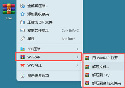解压是压缩的反过程,以前面压缩得到的 1.rar 为例,在压缩包文件上右键,按下图所示进行选择: