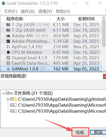 ③ 扫描完后,会出现很多残留文件,点击完成后会自动清理残留文件: