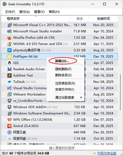 ① 在列表中右击你想要卸载的软件,点击卸载就可以了,我这里以卸载 PotPlayer 为例: