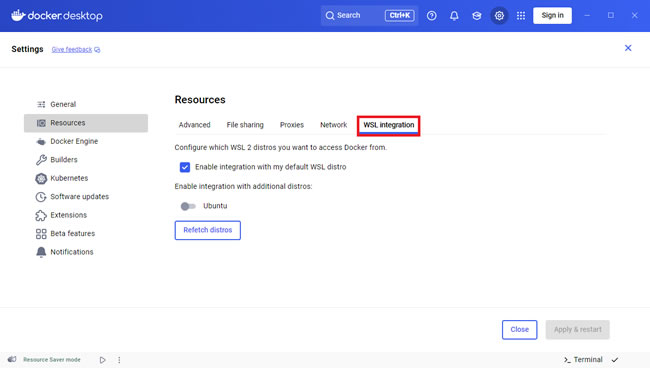 进入「资源 → WSL 集成」选项卡,在「启用集成的 WSL 发行版」中,勾选你需要集成的 Linux 分发版(如 Ubuntu),点击「应用」保存配置。