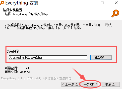 步骤 4:选择安装位置。默认路径是 C:\Program Files\Everything,建议修改将 C 盘改为 F 盘或其他非系统盘,避免重装系统后需要重新索引。点击 "浏览" 选择文件夹,或直接修改路径首字母,然后点击 "下一步"