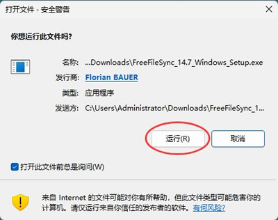 1) 下载 FreeFileSync_Windows_Setup.exe 安装包文件,双击启动安装,系统可能会弹出下图所示的安全提示窗口,点击运行即可。