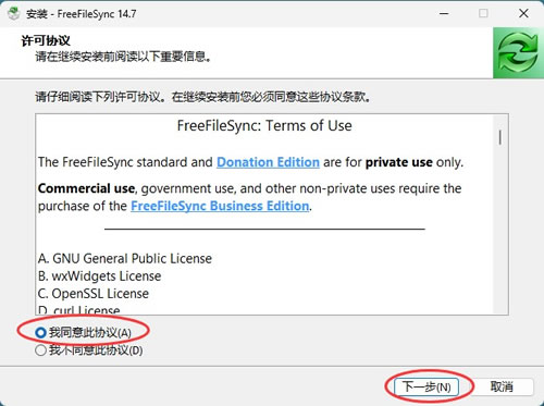 2) 勾选"我接受协议"选项,点击"下一步"。FreeFileSync 使用开源协议,完全免费商用。