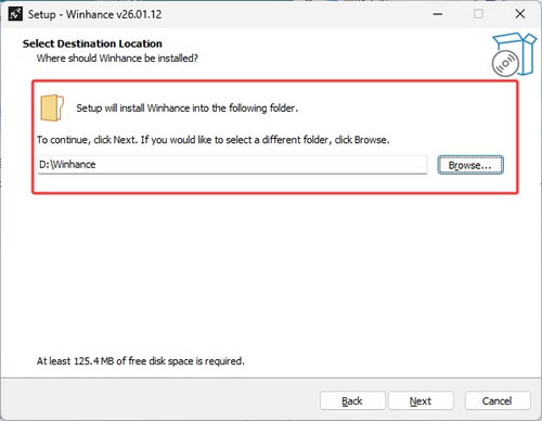 1) 下载 Winhance.14 v26.01.12 安装版.7z 并完成解压,然后双击内部的 .exe 文件启动安装。2)默认安装到 C 盘,这里建议手动更改到其它盘,比如下图中的 D 盘: