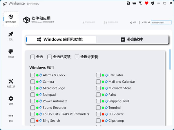 - 顶部导航栏:应用、优化、自定义、高级工具四个主标签
