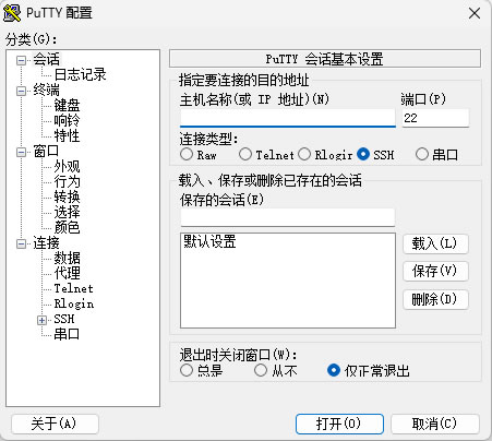 5)安装完成后,可以在开始菜单或桌面上找到 PuTTY 图标。首次运行 putty 时,会显示简洁的配置界面,用户可以立即开始配置远程连接。