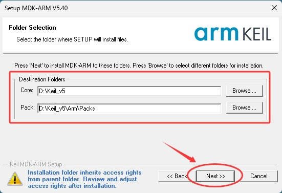 4) 指定 Keil5 的安装位置,这里建议安装到非系统盘: