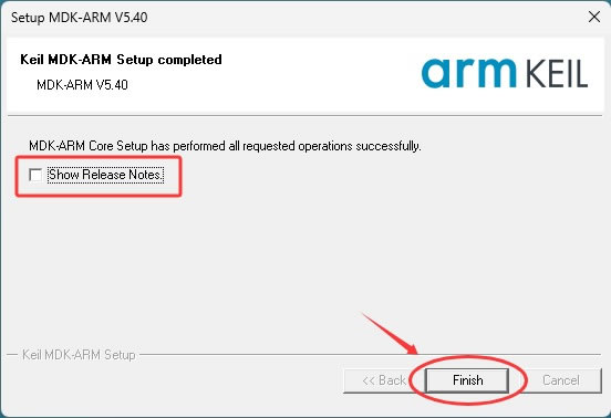 7) 可以取消勾选项,然后点击 Finish,Keil 5 就安装完成了: