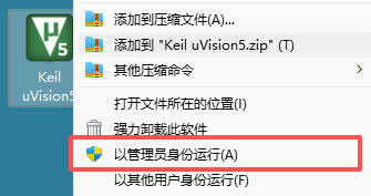 1) 在电脑桌面上找到刚安装好的 Keil uVision5,右键“以管理员身份运行”: