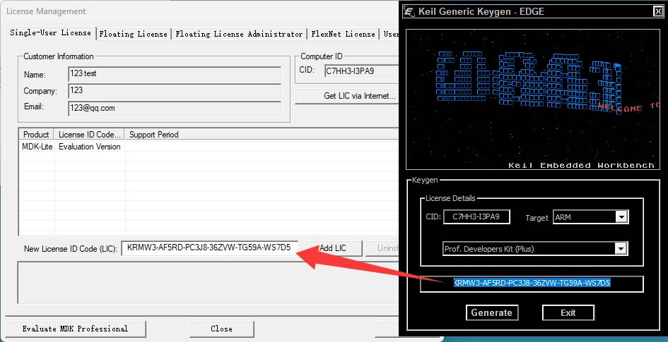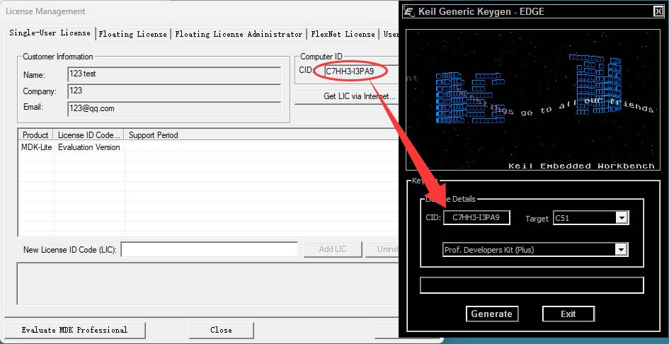 6) 将软件许可证管理器中的 CID 后面的 ID 复制到注册机 CID 后面的框里: