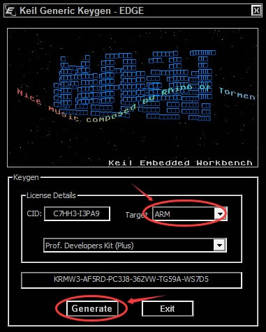 7) 将注册机的 Target 选择到 ARM,点击“Generate” :