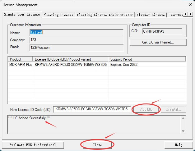 点击“Add LIC”按钮,提示激活成功后,点击 Close: