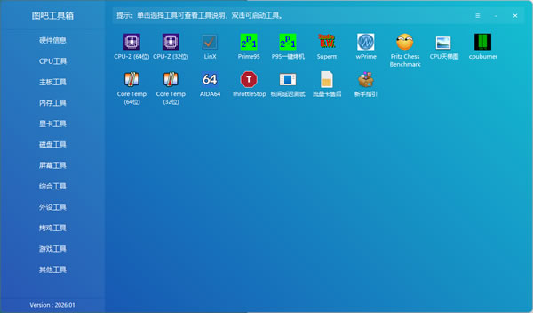 图吧工具箱是一款开源、免费、绿色、纯净的硬件检测工具合集,专为所有计算机硬件极客、DIY爱好者、各路大神及小白制作。自2014年诞生以来,经过12年的持续稳定更新,图吧工具箱已经成为国内最受欢迎的硬件检测工具集合,集成了大量常见的硬件检测、评分和测试工具,真正做到一键下载、方便使用。截止发文,图吧工具箱官方最新版是 2026.1.1,安装包下载地址:图吧工具箱安装包