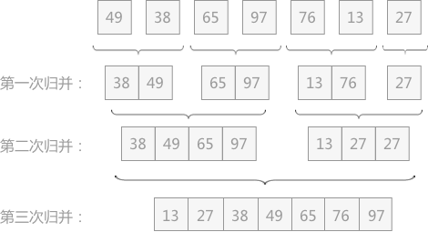 {49,38,65,97,76,13,27}进行 2-路归并排序的过程如图 1 所示: