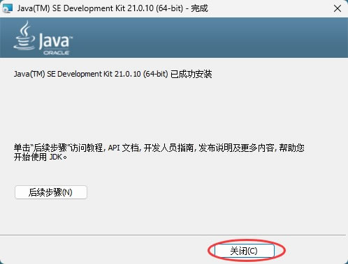3)等待安装完成。安装完成后,点击"关闭"退出安装程序。JDK 21现在已经安装到你的电脑上了。