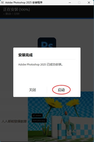4)等待安装完成,当提示"Photoshop 2025 已经成功安装"时,表示安装完成。你可以点击"启动"按钮立即启动Photoshop,或者稍后从开始菜单或桌面快捷方式启动。